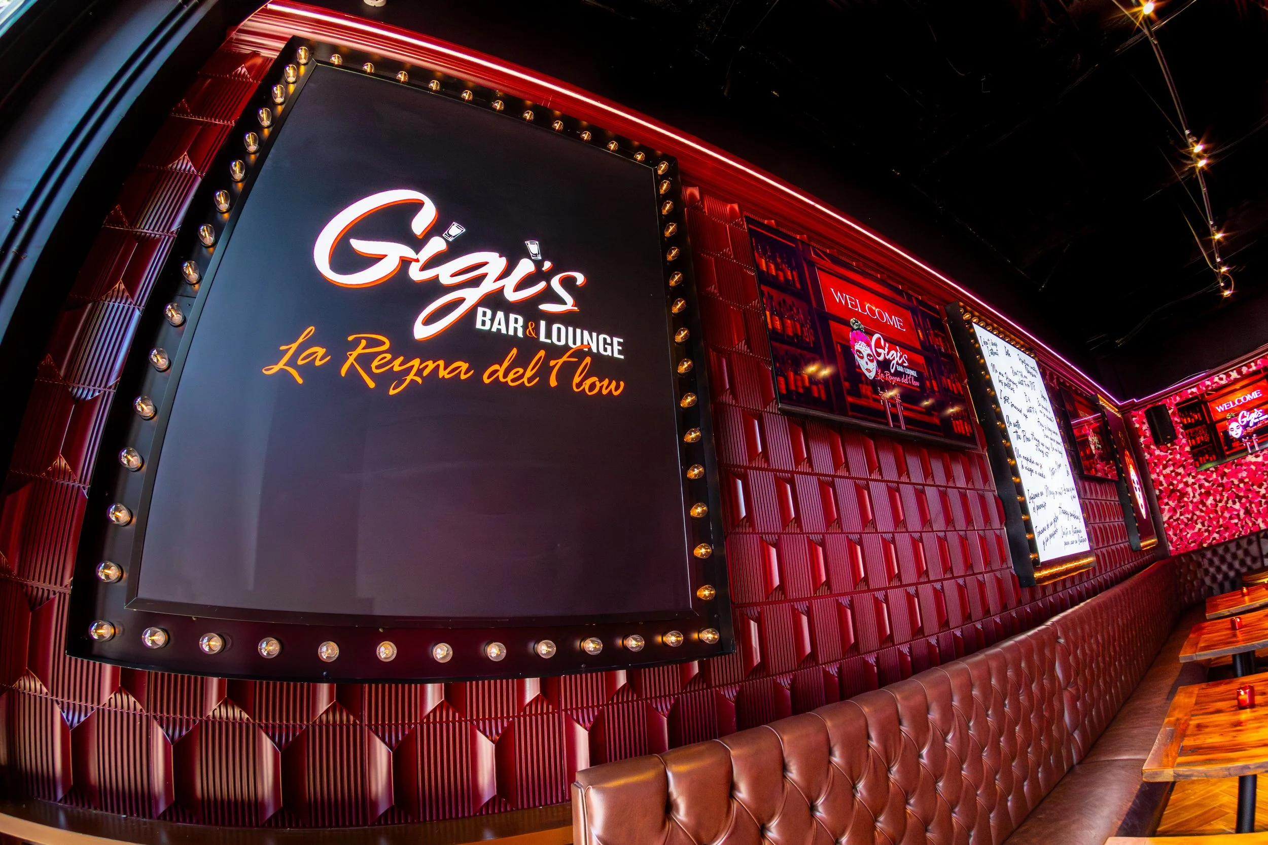 Interior of Gigi's Bar & Lounge with illuminated signs, red quilted wall panels, and seating area.