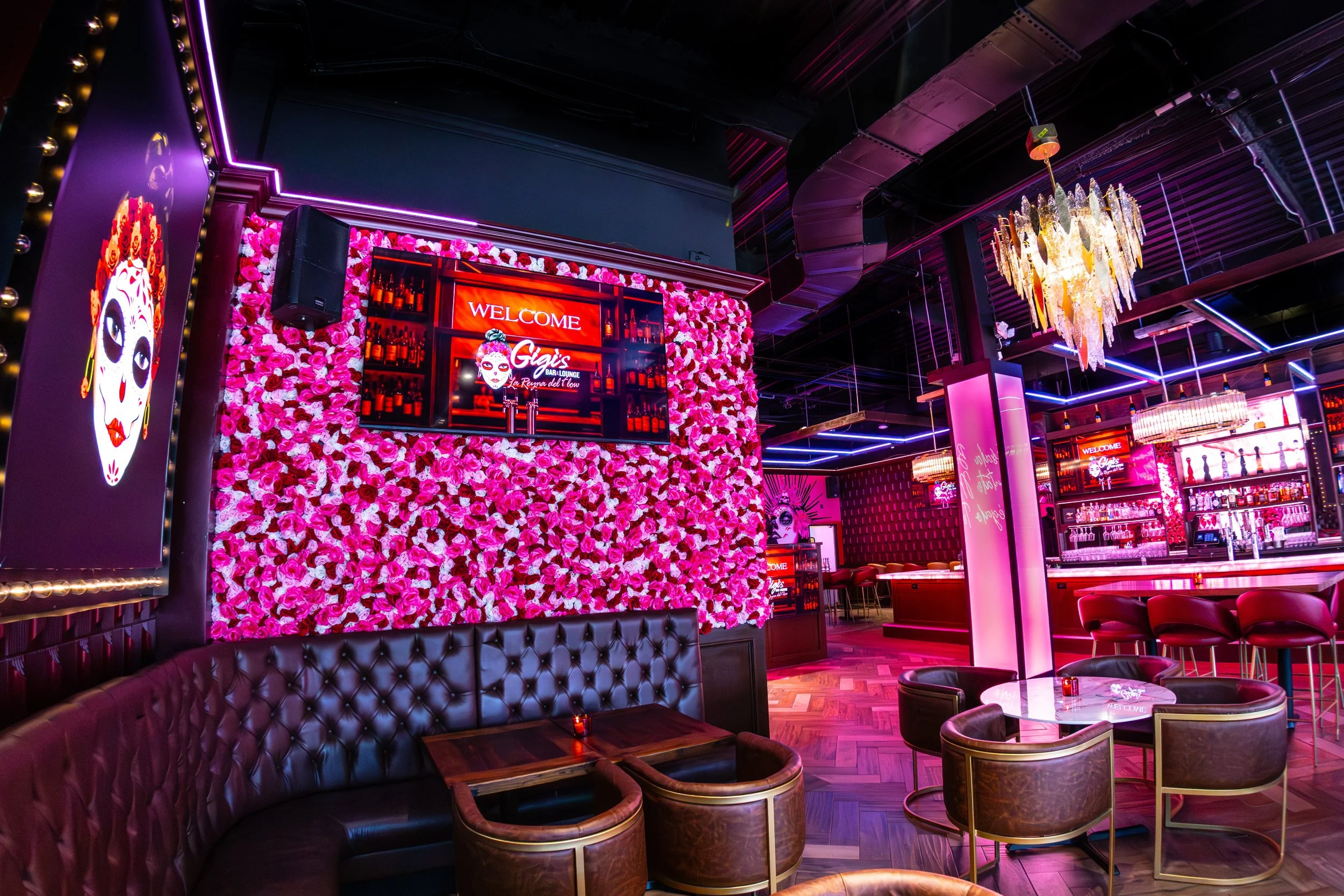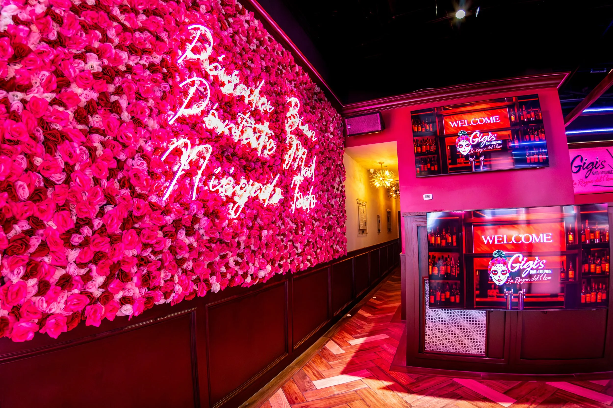 Interior of a bar or lounge with bright pink neon signs reading "Gigi's Bar Lounge" and a wall decorated with pink roses and a neon message. The space features warm lighting, wood flooring, and digital screens displaying welcome messages.